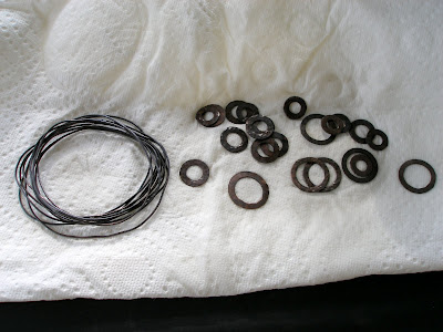 I pulled together all the things I needed for the project yesterday, and headed to the front porch. Rather do this sort of thing outside, because I've heard different things about the smell of the LOS. I laid everything out on the table on the porch.I did the LOS process with cold water. I had 2 old coffee cups. To one cup of water, I added baking soda. The neutralizer. To the other, I added a little bit of the LOS gel, using a wood skewer. Plopped all the (pre-hammered) copper washers into the LOS along with the copper wire, and waited. Stirred. And pulled them out when they were all nice and black.
